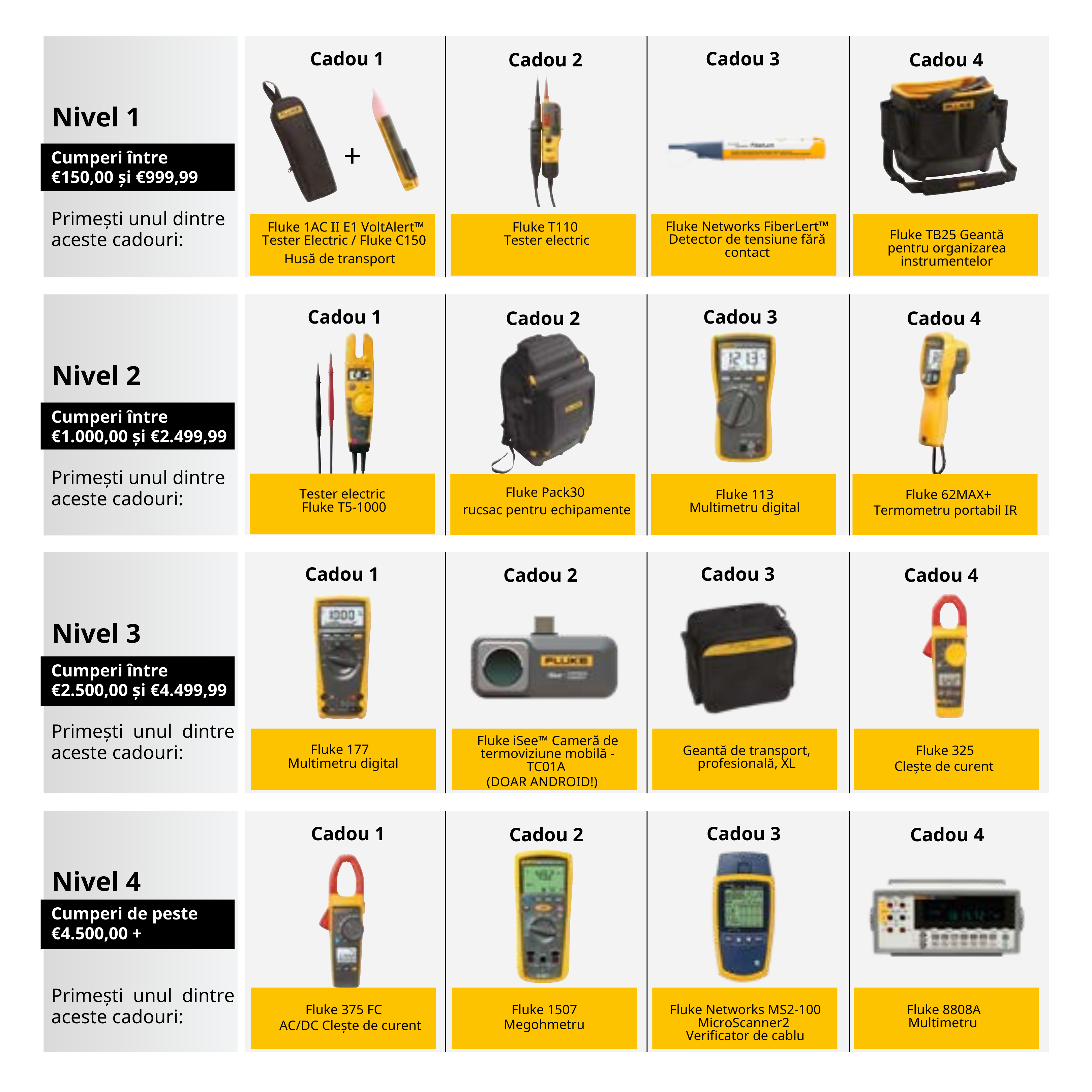 Cumparati instrumente Fluke, trimiteti online factura si alegeti aparatul Fluke GRATUIT. Nu conteaza daca cumparati un produs Fluke Industrial, un produs Fluke Calibration sau un produs Fluke Networks. In functie de suma cheltuita, (minimum 150€) poti alege un produs GRATUIT dintre produsele Fluke eligibile din oferta, care va fi livrat la adresa mentionata, pe care il poti utiliza imediat dupa ce il primesti.